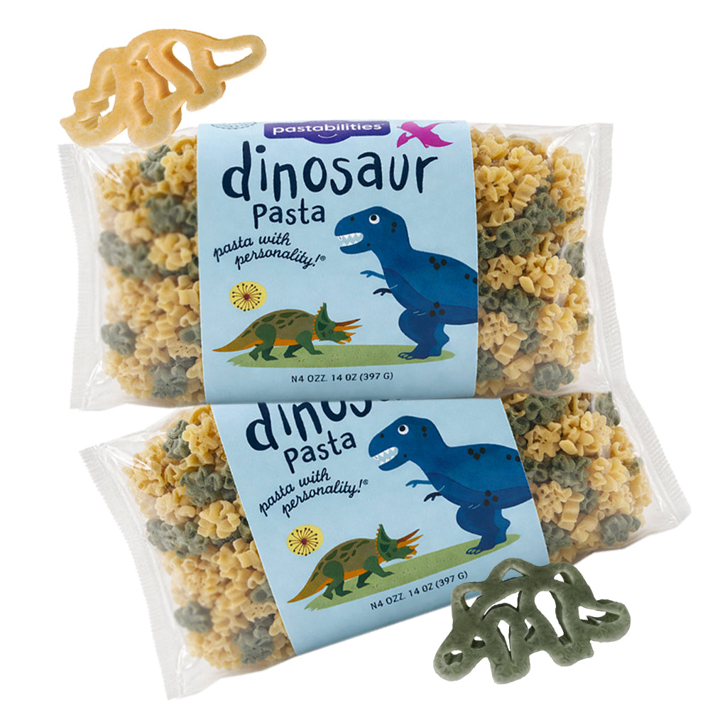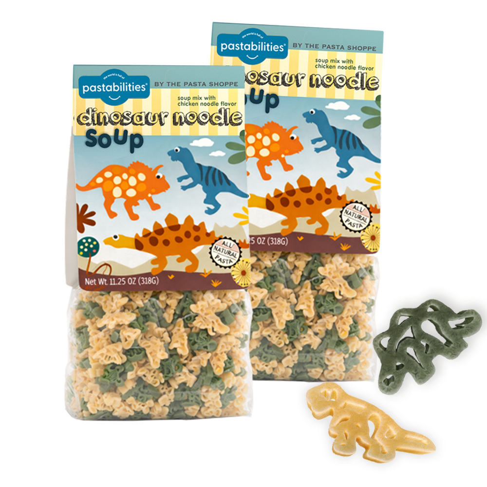 The Dinosaur Deluxe Bundle is the ultimate adventure pack for little dino lovers and big kid hearts alike. This fun-filled collection includes 2 bags of Dinosaur Pasta, 2 Dinosaur Chicken Noodle Soups, and 2 Dinosaur Pasta ’n Cheese, giving you everything you need for easy, smile-worthy meals all week long. From cozy soup nights to creamy mac and cheese to classic pasta dinners, every bite is packed with prehistoric fun that turns mealtime into playtime.