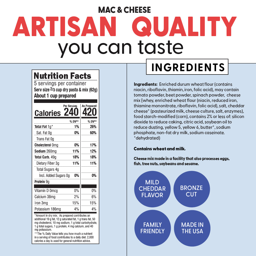 Pasta: Enriched Durum Wheat Flour (Contains Niacin, Riboflavin, Thiamin, Iron, Folic Acid), May Contain Spinach Powder, Tomato Powder, Beet Powder. Contains Wheat.