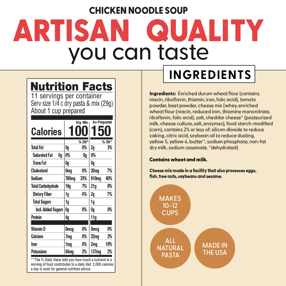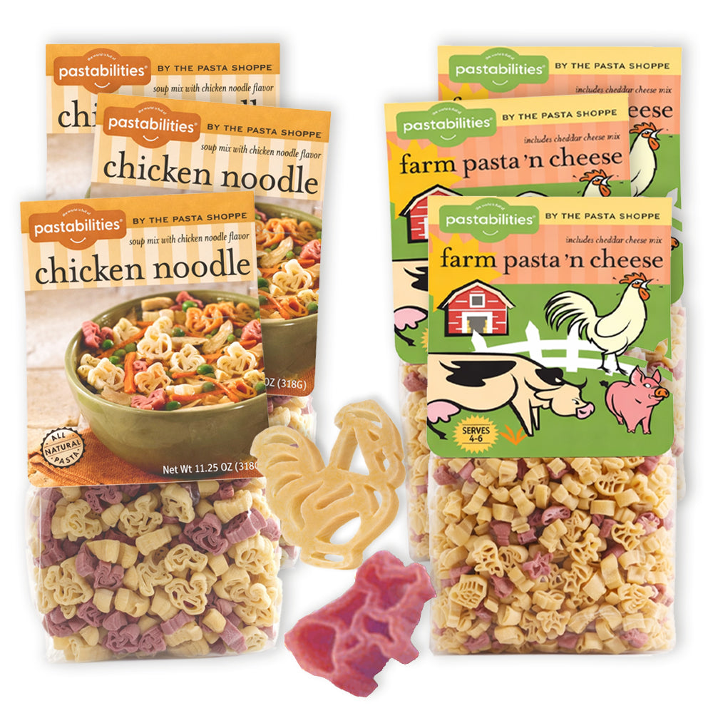 • Includes 6 bags total: 3 packages of Chicken Noodle Soup (11.25 oz each), and 2 packages of Farm Pasta ‘n Cheese (12 oz. each)